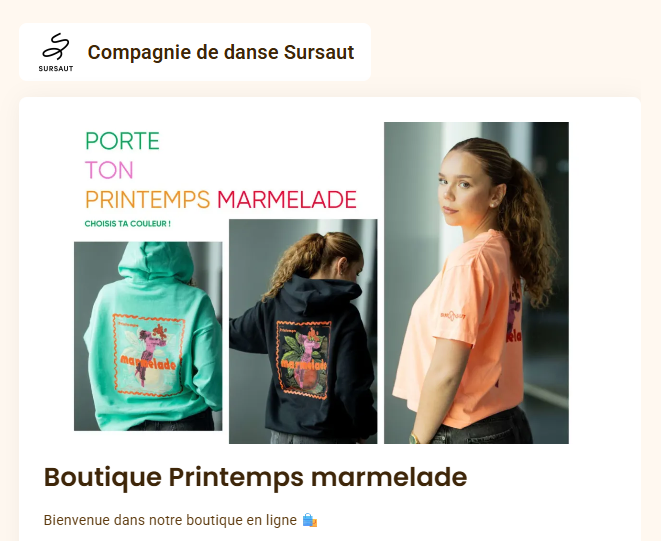 Visitez notre boutique Printemps marmelade pour des t-shirts et hoodies aux couleurs de notre spectacle Printemps marmelade!